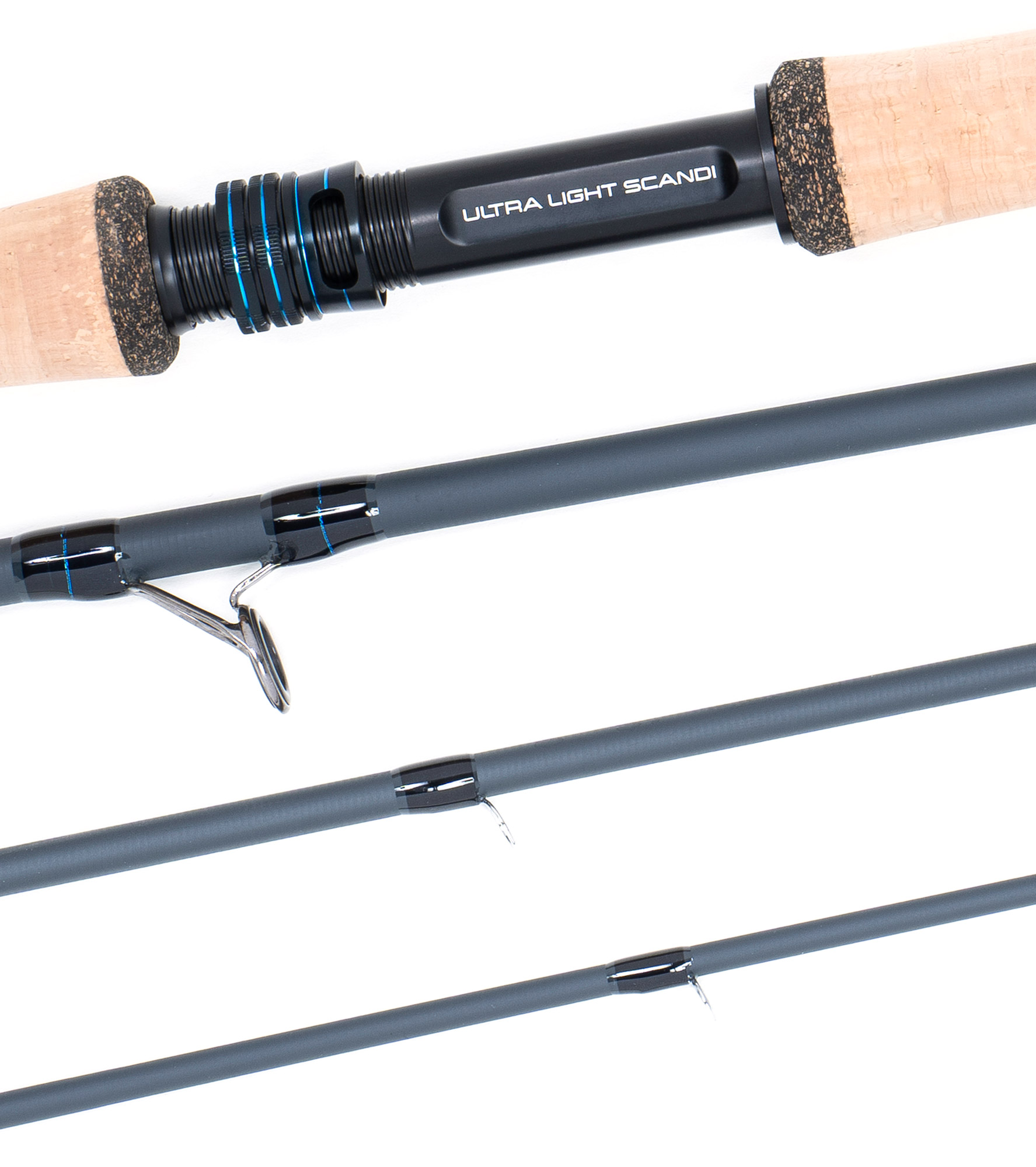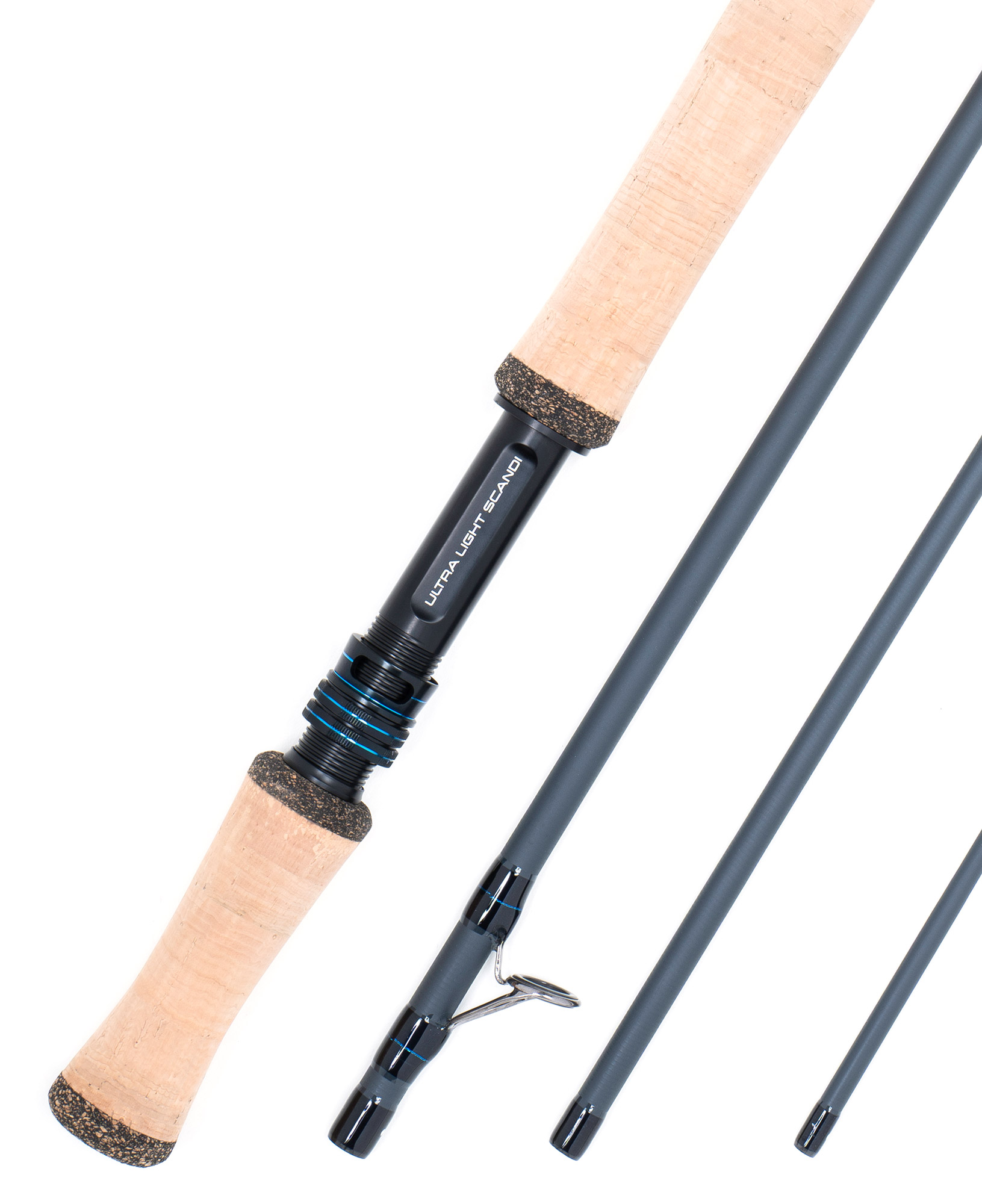 - Customized matte black reel seat with metallic blue trim and Ultra Light Scandi engraving