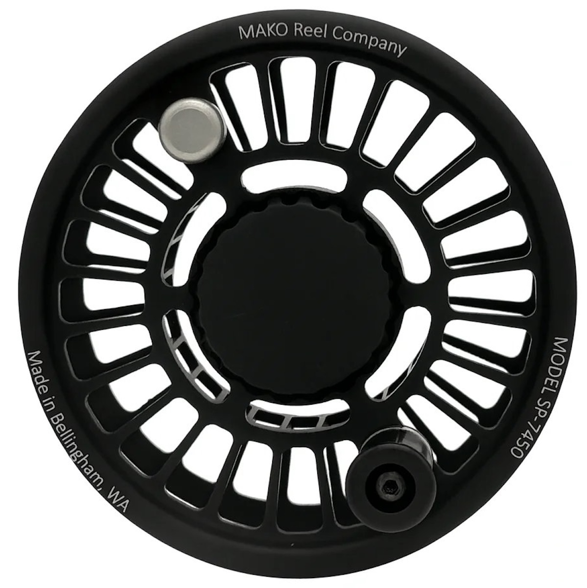 Mako Reel Co. fly reel matte platinum on black