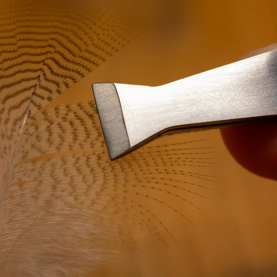The Renomed stainless steel tweezers FT4 are fibre grasping tweezers specially designed to cleanly separate fibres from the quill or pick up materials in a controlled manner. They have a wide, flat tip with a gripping surface of approx. 10 mm - ideal for cleanly and gently detaching fibres from cock feathers or softer feathers such as chicken, duck or partridge without damaging the quill. With an overall length of approx. 100 mm, it offers optimum control when working.