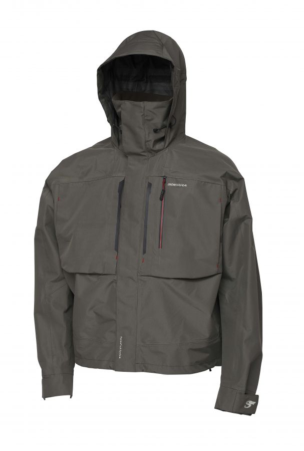 Scierra FusionTech wading jackets offer high functionaliy at an affordable price. The 3-layer membrane with TPU-laminate and a DWR-finish keeps water out and allows moisture from the body to escape creating a comfortable body climate. Mulitple pockets, handwarmer pockets and a spacious back pocket take care of storage and the 2-way adjustable hood with a flexible wired brim keeps rain and wind off your face. Extra wide adjustable cuffs against slipping with internal, quick-drying fleece lining and an internal PU coatnig prevent water from entering when casting with wet hands. Last but not least the D-ring on the back allows you to to install your wading net in a handy position.