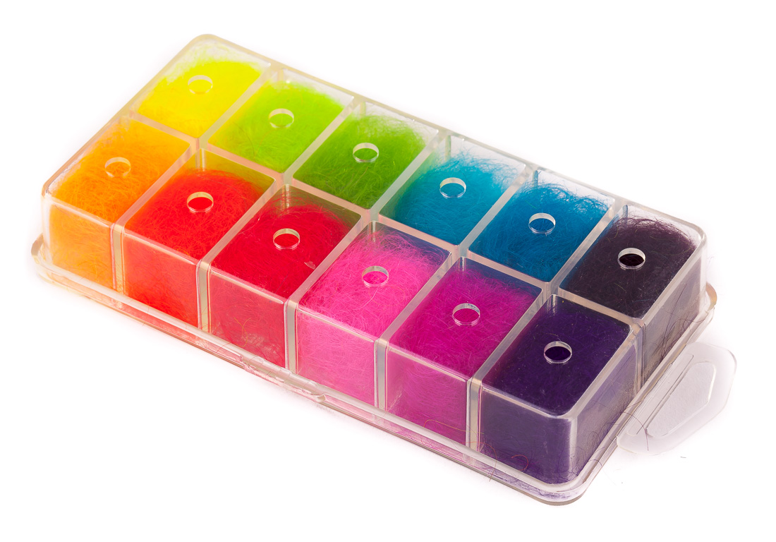 Dubbing dispensers eliminate the need to browse your entire tying bench for that one specific bag of dubbing and make dubbing handling a breeze – no more dubbing flying across the whole work space. Instead you have the full range of colors to choose from right in front of you. Also in the price department dispensers offer better value for money compared to singular portions. In case you run out of your favorite color you can simply re-purchase that specific color and refill the dispenser.