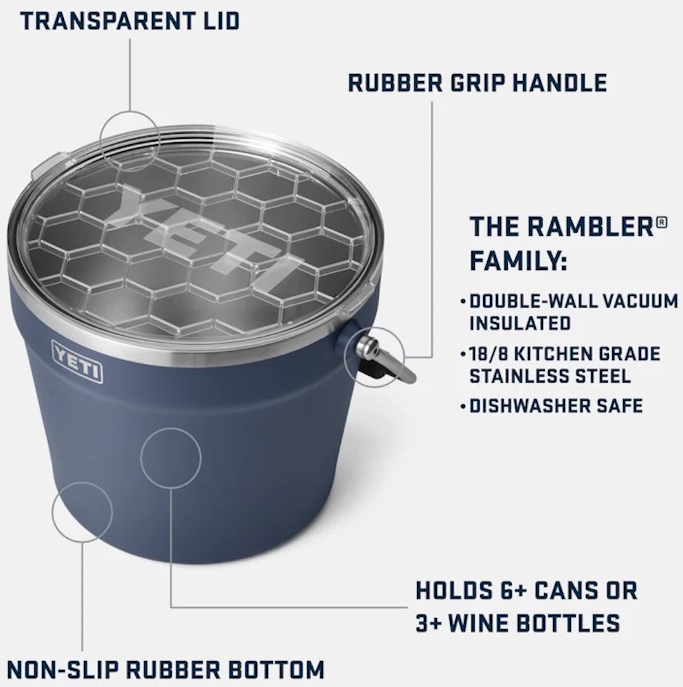 Made from durable 18/8 stainless steel, the YETI 7.6 L Beverage Bucket is particularly long-lasting and resistant to scratches and corrosion. The double wall keeps drinks and ice chilled for hours, while the sturdy handle makes it easy to transport even when fully loaded. The solid construction also ensures a secure stand on a wide variety of surfaces.